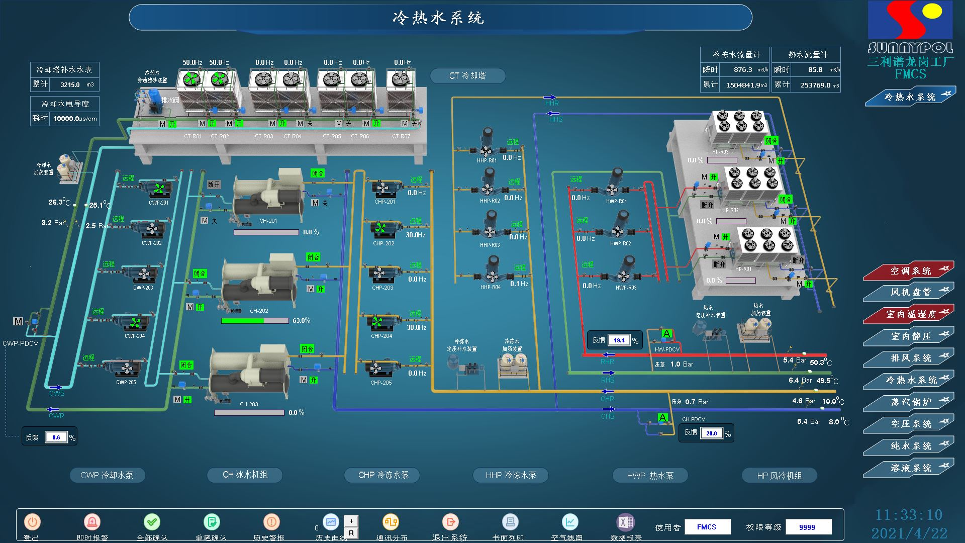 3、實(shí)現(xiàn)動(dòng)力站一鍵啟停功能:在中控室畫(huà)面上點(diǎn)擊一鍵啟停按鈕,實(shí)現(xiàn)水閥、水泵、冰機(jī)的連鎖控制,高效控制,達(dá)到節(jié)能的目標(biāo)也降低了企業(yè)管理人員數(shù)量;