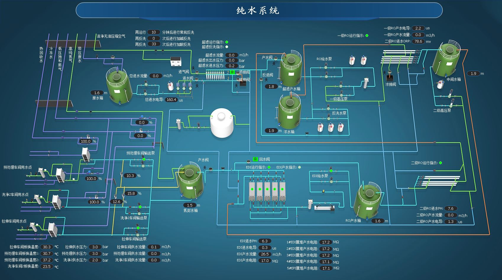 3、實現動力站一鍵啟停功能:在中控室畫面上點擊一鍵啟停按鈕,實現水閥、水泵、冰機的連鎖控制,高效控制,達到節能的目標也降低了企業管理人員數量;